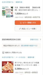 ゆる:「au PAY マーケットで知育おもちゃ(1,830円)と、越前かに問屋「ますよね」の特大ブラックタイガー(3,380円)を注文したよ!実際の注文履歴がこれ👇」
